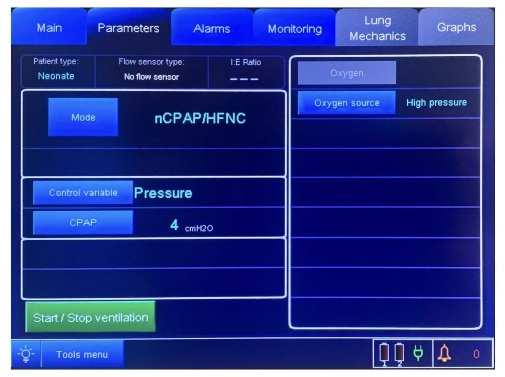 - Full FiO₂ Capability: Internal compressor and oxygen blender deliver 21–100% O₂ without external gas supply.